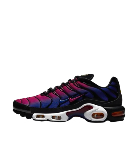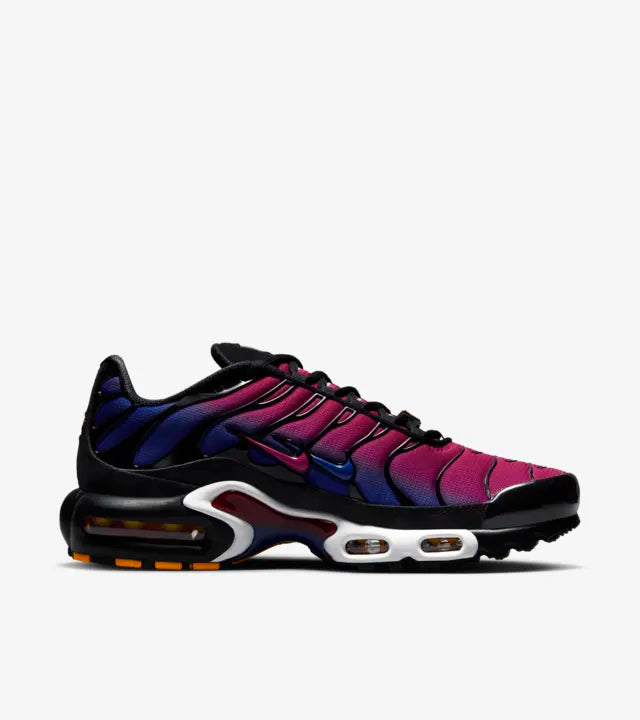 La Nike Air Max Plus Patta FC Barcelona présente une base en mesh dégradé allant du bleu marine vers le rouge, accompagnée d'empiècements en TPU noir accordés au mudguard en cuir verni. Sur les panneaux latéraux, on remarque deux Swooshs, l'un est vêtu de rouge tandis que l'autre se pare de bleu marine. On remarque le logo du Barça au niveau des lacets qui peaufine le tout.